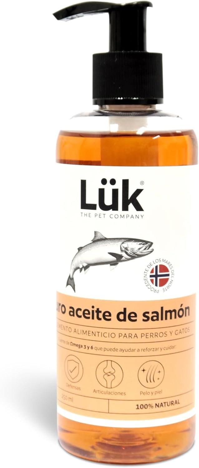 LÜK – Aceite de Salmón 100% Natural para Perros y Gatos es el complemento perfecto para el cuidado de tu peludo amigo. Este aceite, rico en Omega 3 y 6, no solo realza la salud de la piel, sino que también aporta un brillo espectacular al pelaje de tu mascota.
