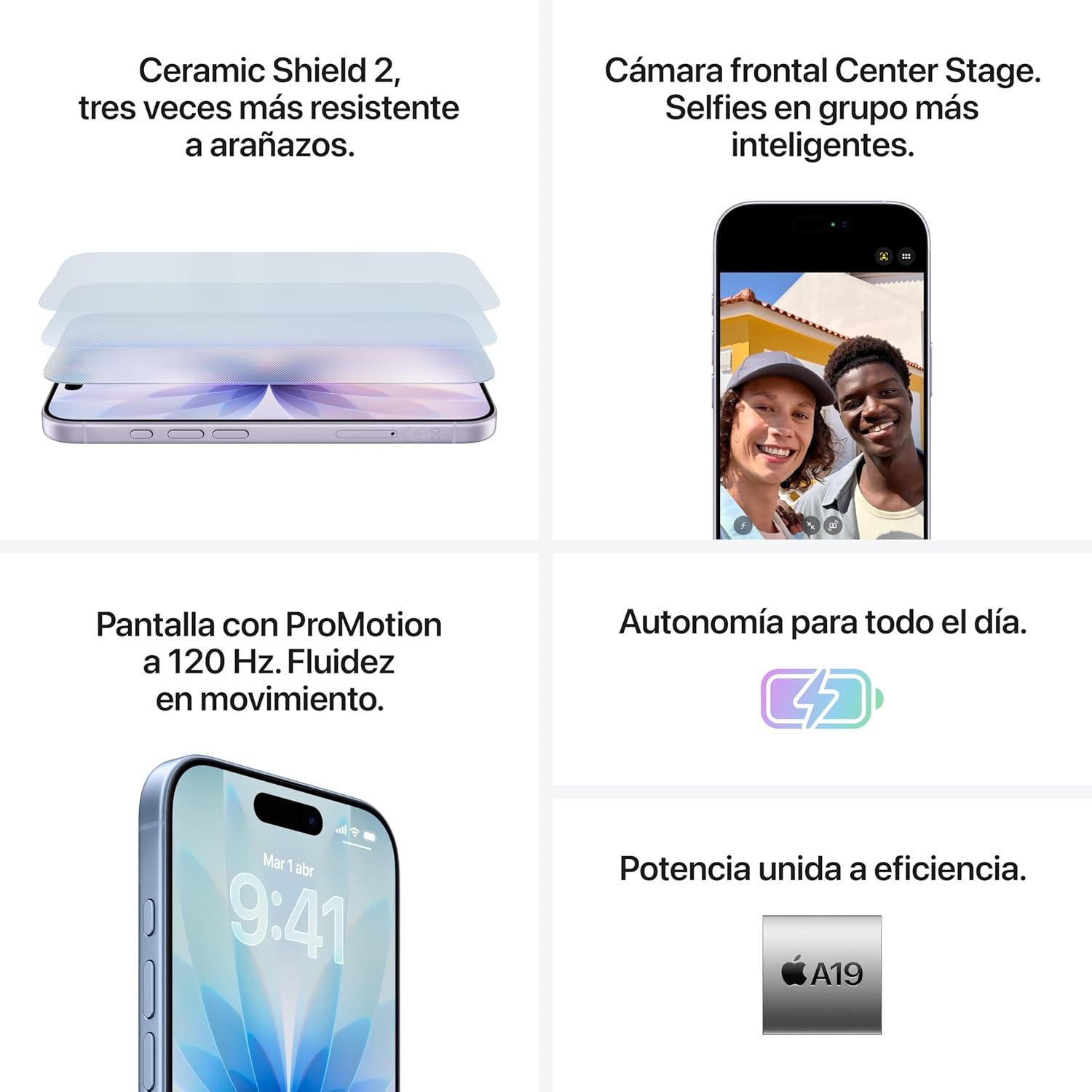 Resume el contenido del producto de manera muy técnica en 250 palabras sobre Apple iPhone 17 256GB: 6.3-inch screen with Promotion, A19 chip, front center stage camera, increased scratch resistance, autonomy for the whole day; Lavender, editando el texto y subrayando las características clave del teléfonoPrecio en Amazon: €959.00 - €929.00 (as of Feb 08, 2026 09:22:21 UTC – Detalles del precio)