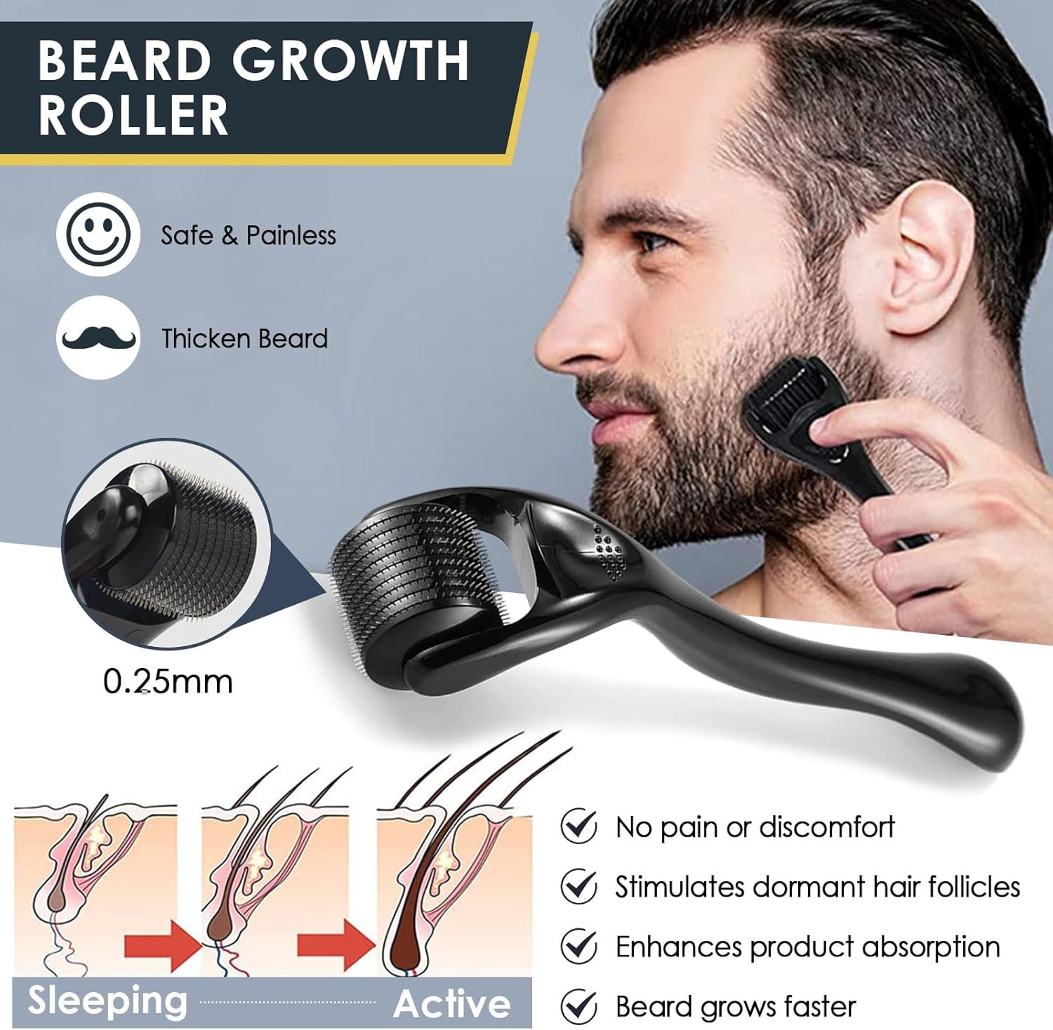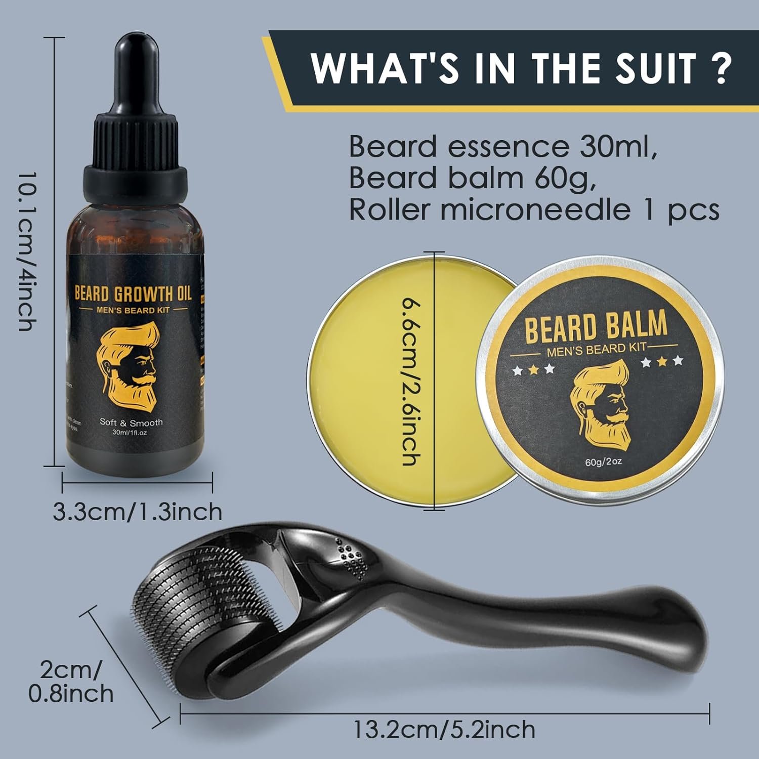 Resume el contenido del producto de manera muy amigable y sobre todo enfocado a los hombres en 250 palabras sobre Beard Growing Kit 0.26 mm Roller, 30 ml Beard Oil, 60 g Beard Balsam, Grow Beard, Stimulates Beard Growth and Growth, Beard Kit for Men, Facial Hair Growth, editando el texto y subrayando las características clave del árticuloPrecio en Amazon: €11.99 (as of Jan 17, 2026 11:51:11 UTC – Detalles del precio)