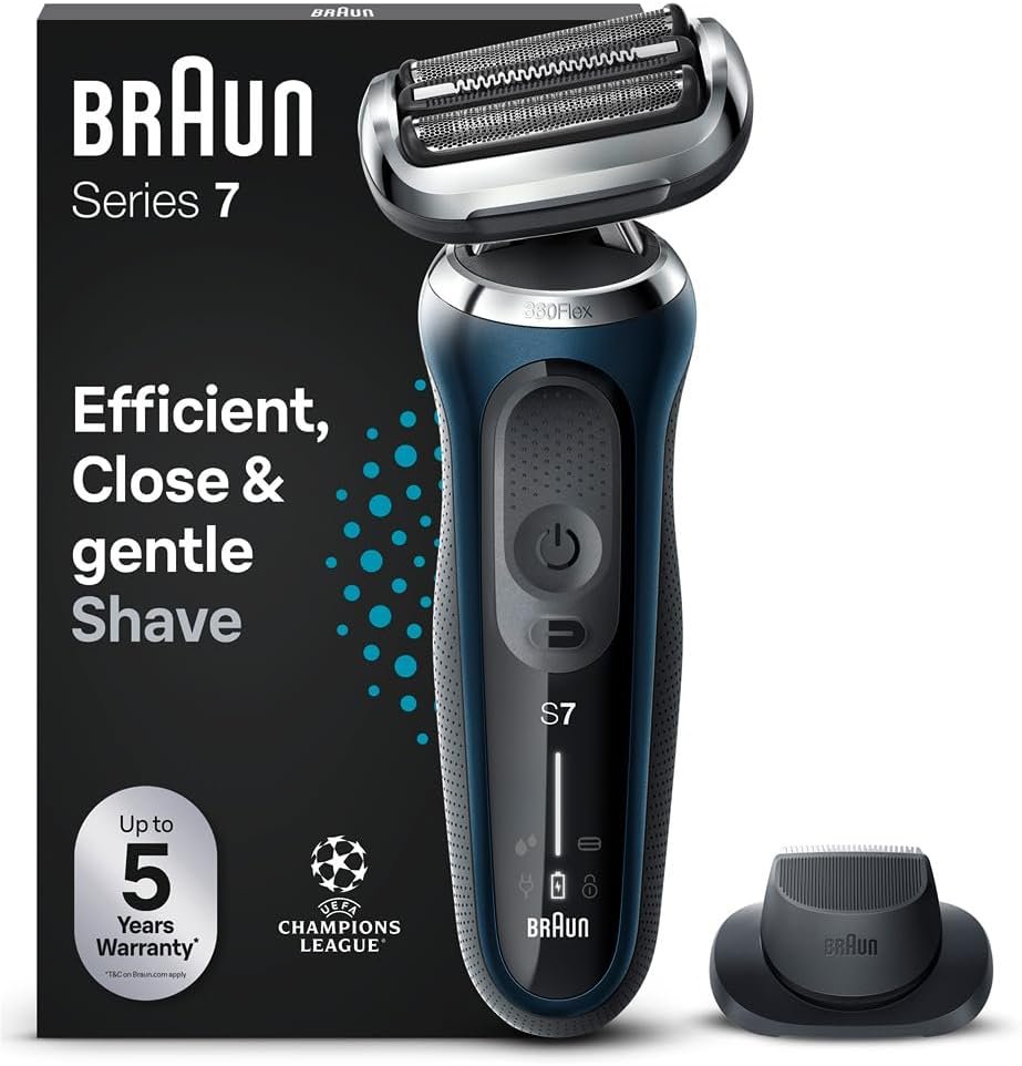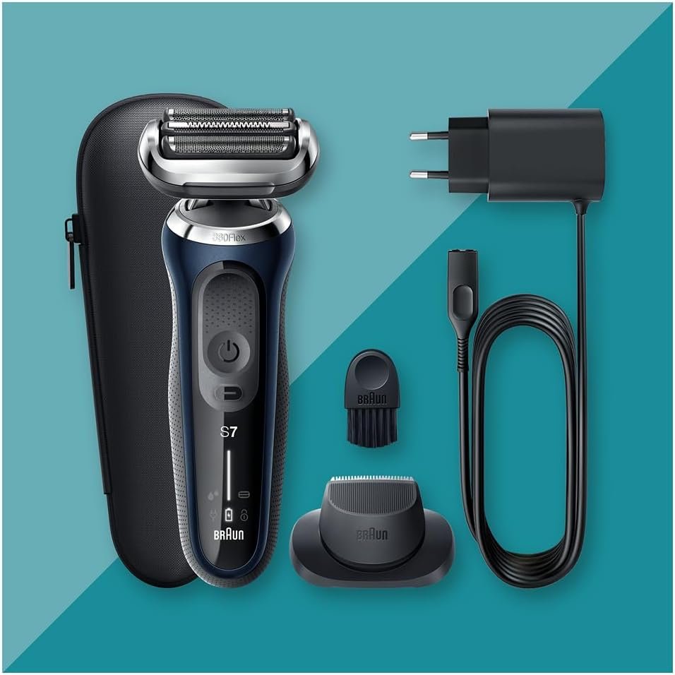 Resume el contenido del producto de manera muy amigable y sobre todo enfocado a los hombres en 250 palabras sobre Braun Series 7 Men’s Electric Shaver, Beard Shaver with EasyClick Precision Trimmer, 360° Flex, Dry and Wet Use, Rechargeable, Wireless, 71-B1200s, Blue, editando el texto y subrayando las características clave del árticuloPrecio en Amazon: €229.99 - (€199.00 / count) (as of Dec 29, 2025 11:11:28 UTC – Detalles del precio)
