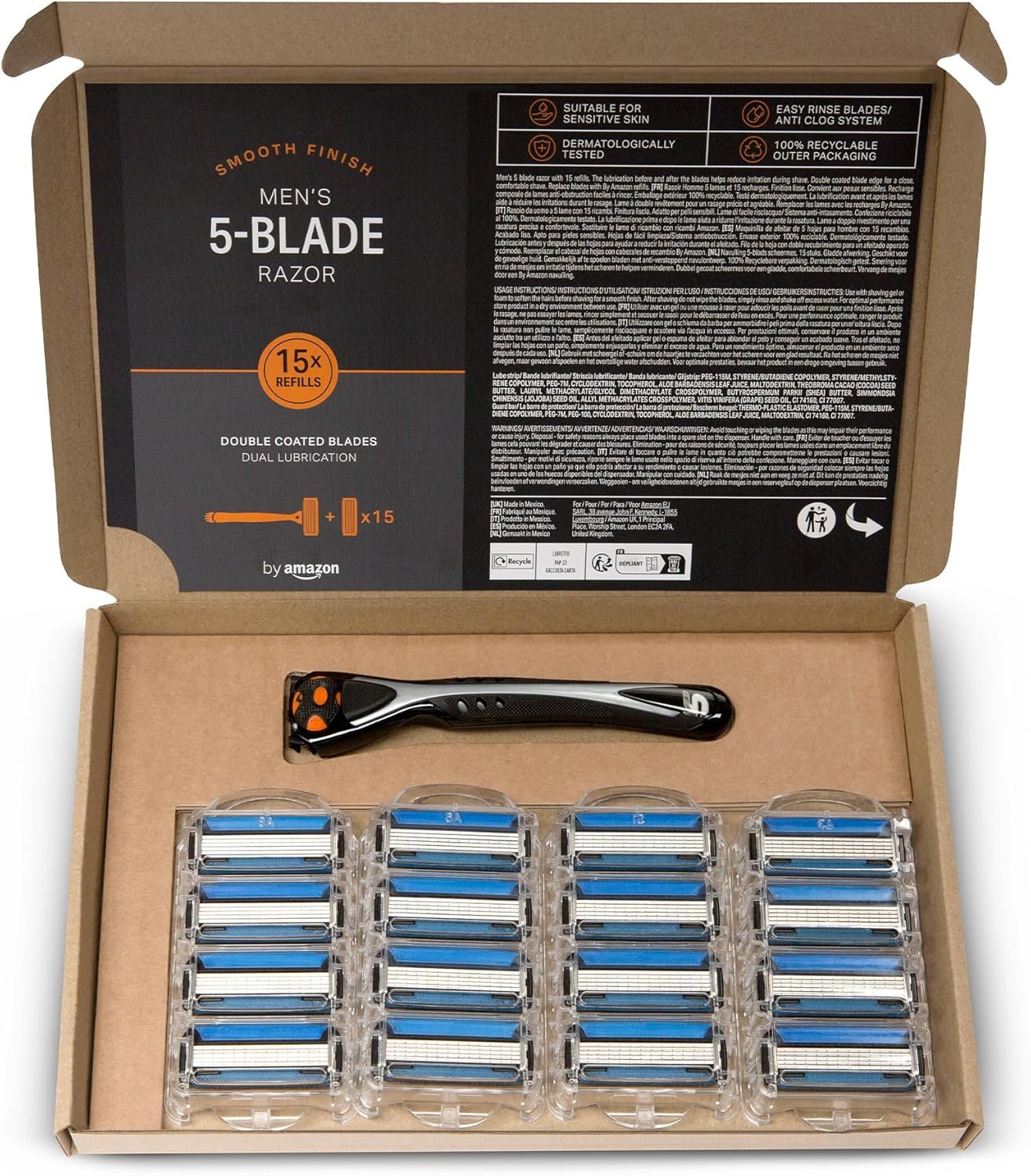 Resume el contenido del producto de manera muy amigable y sobre todo enfocado a los hombres en 250 palabras sobre by Amazon Men’s 5 Blade Razor with 15 Refills, editando el texto y subrayando las características clave del árticuloPrecio en Amazon: €17.96 (as of Dec 31, 2025 11:18:30 UTC – Detalles del precio)