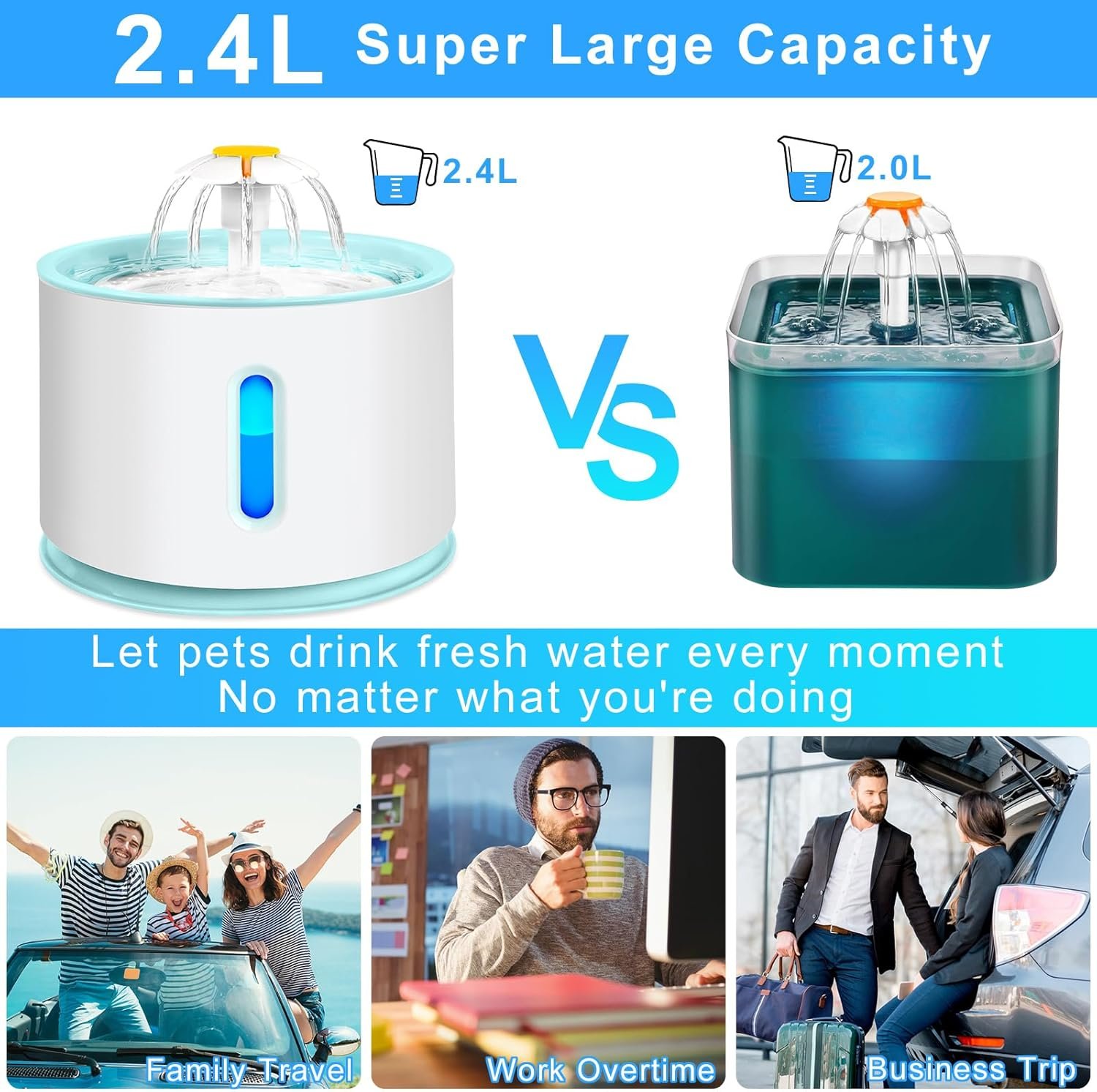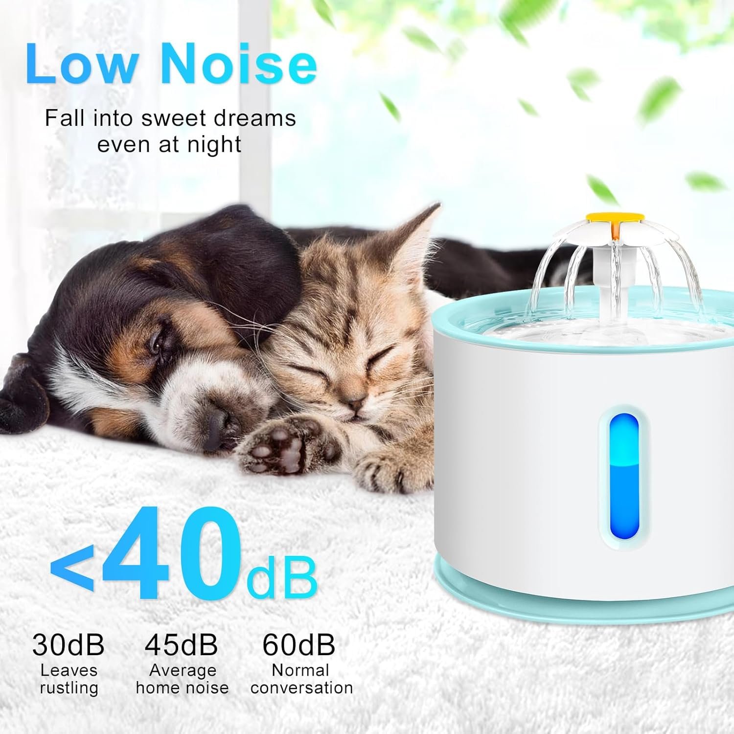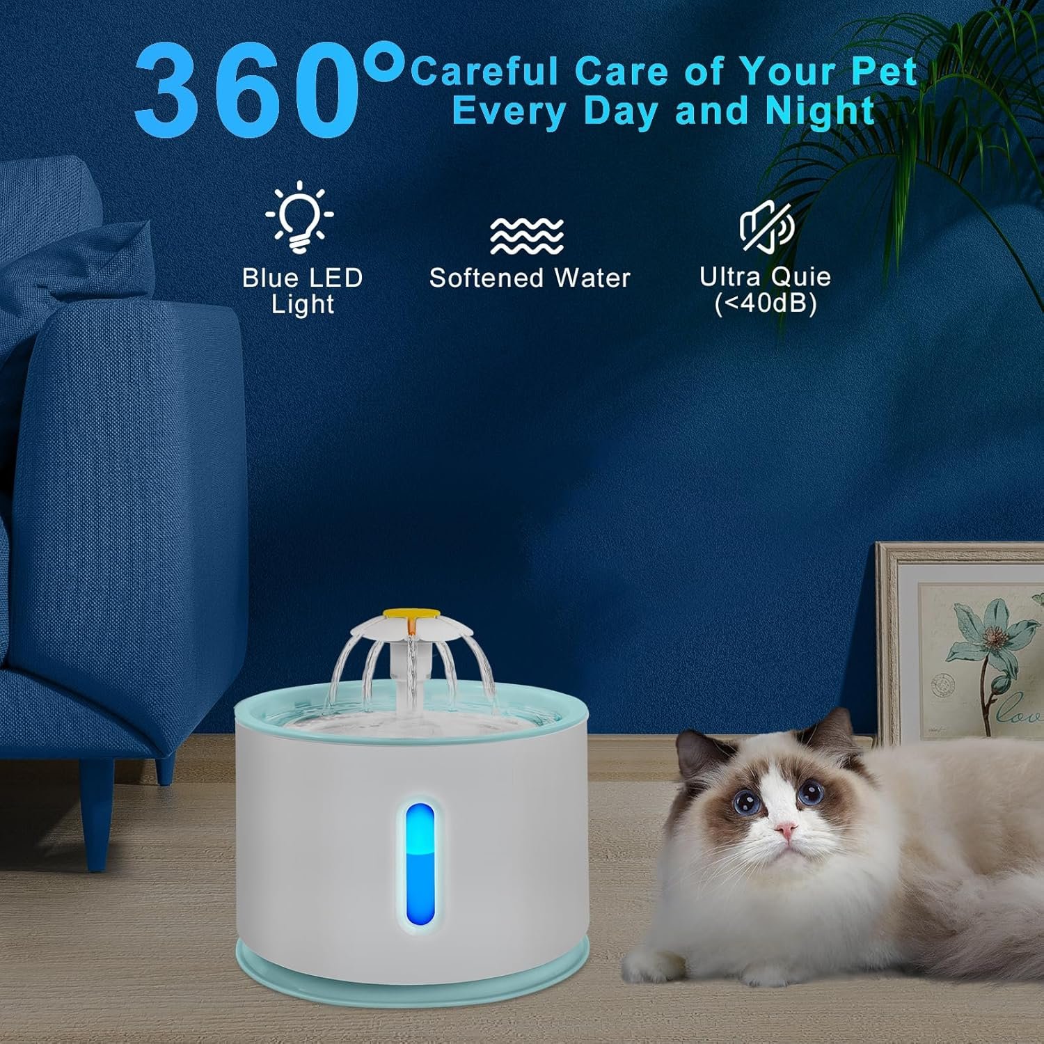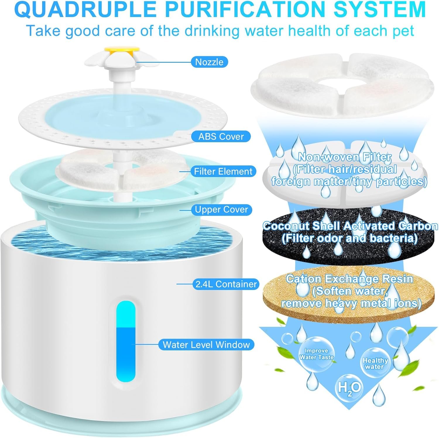 Resume el contenido del producto de manera muy amigable y sobre todo enfocado al cuidado de mascotas y la salud de ellas en 250 palabras sobre Cat Drinker 2.4L with Four Activated Carbon Filters, Ultra Quiet Pet Water Fountain with LED Light – Quadruple Filtration System, Three Water Flow Modes, editando el texto y subrayando las características clave del articuloPrecio en Amazon: €20.99 - €19.99 (as of Dec 11, 2025 15:32:12 UTC – Detalles del precio)