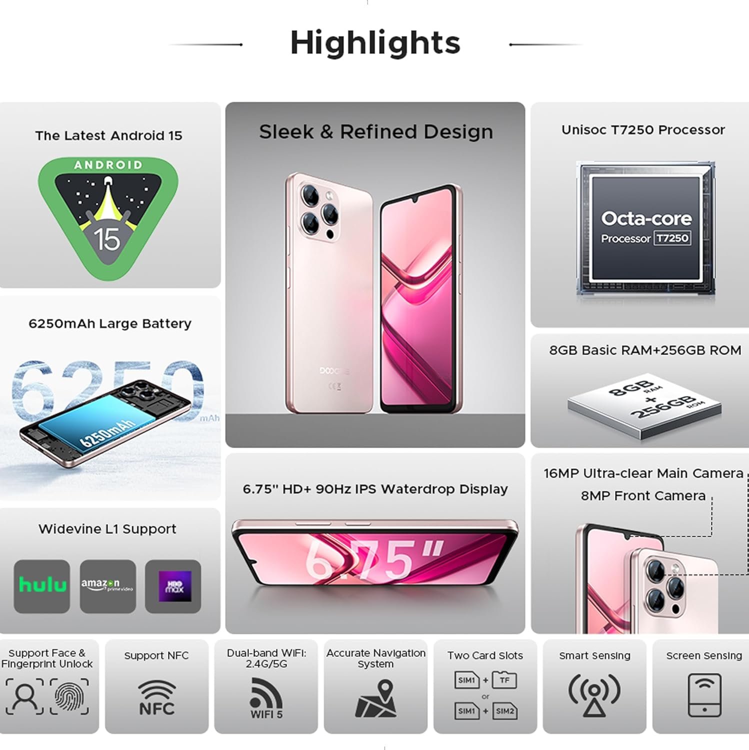 Resume el contenido del producto de manera muy técnica en 250 palabras sobre DOOGEE Note58 Pro 4G Android 15 Mobile Phone, 32GB RAM + 256GB ROM, 6250mAh Battery, 6.75-Inch HD+ 90Hz Screen, AI Camara 16MP, Octa-Core, Dual SIM, NFC, Smartphone Free, 2025, Gold, editando el texto y subrayando las características clave del teléfonoPrecio en Amazon: €129.99 (as of Jan 13, 2026 09:34:34 UTC – Detalles del precio)