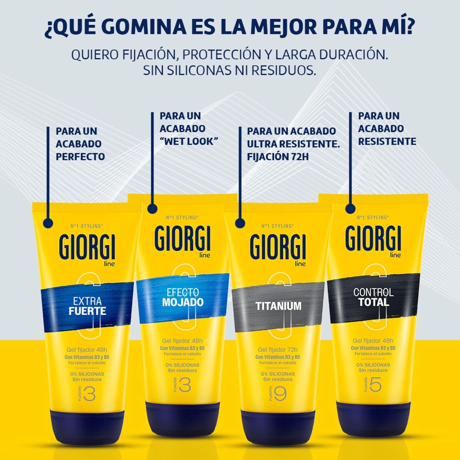 Resume el contenido de Giorgi Line – Extra Strong Gummy with Vitamins B3 and B5 – Extra Strong Fixation 3 and 48h Duration – Alcohol or Silicone Free – No Residue and No Grease – Professional Glossy Finish – 170ml en español y en sólo 10 palabras