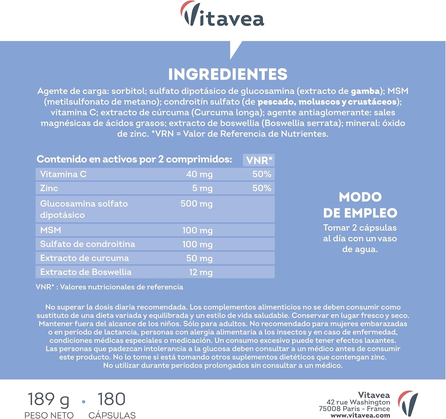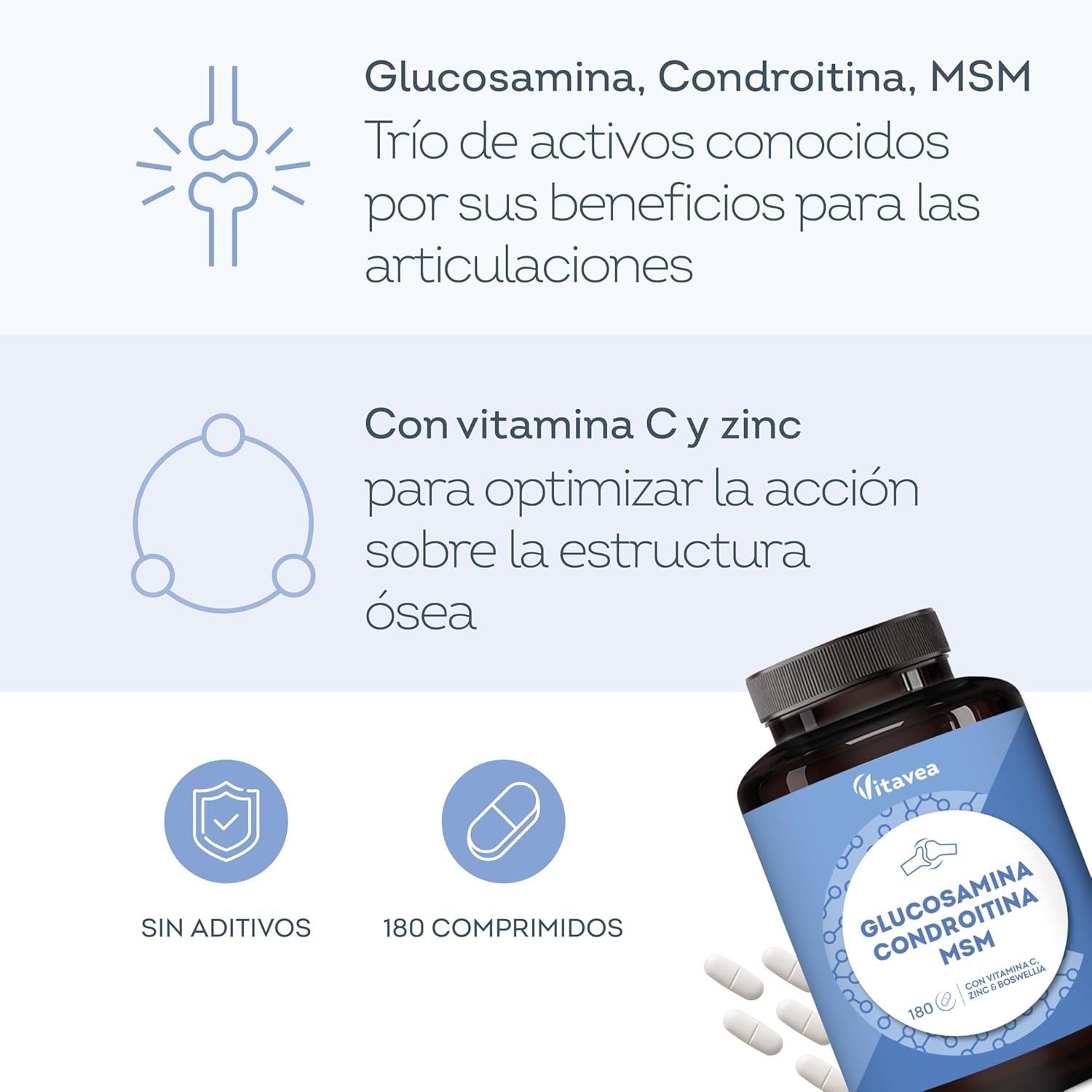 Resume el contenido del producto de manera muy amigable y sobre todo enfocado al fitness y la salud en 250 palabras sobre Glucosamine, Chondroitin and MSM – Joint Complex with Vitamin C and Zinc – Advanced Formula for Bones and Cartilage – 180 Tablets, 90 Days – Vitavea, editando el texto y subrayando las características clave del articuloPrecio en Amazon: €18.90 - €17.90