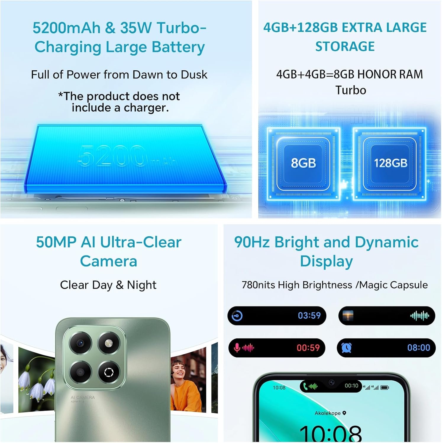 Resume el contenido del producto de manera muy técnica en 250 palabras sobre HONOR X6b 4G Smartphone 4GB 128GB, 50MP Camera, 5200mAh Battery, 6.56″ 90Hz TFTLCD, Android 14, Dual Sim, NFC, Green, editando el texto y subrayando las características clave del teléfonoPrecio en Amazon: €99.99 (as of Feb 28, 2026 09:15:41 UTC – Detalles del precio)