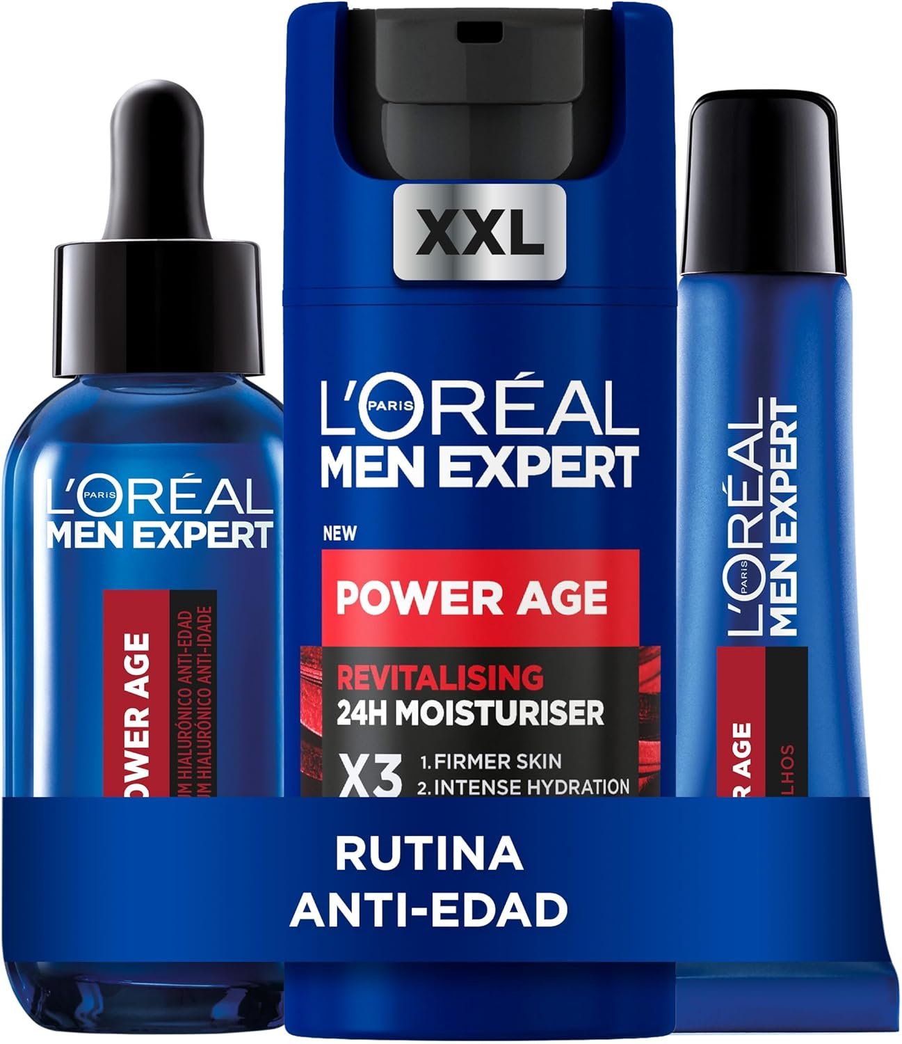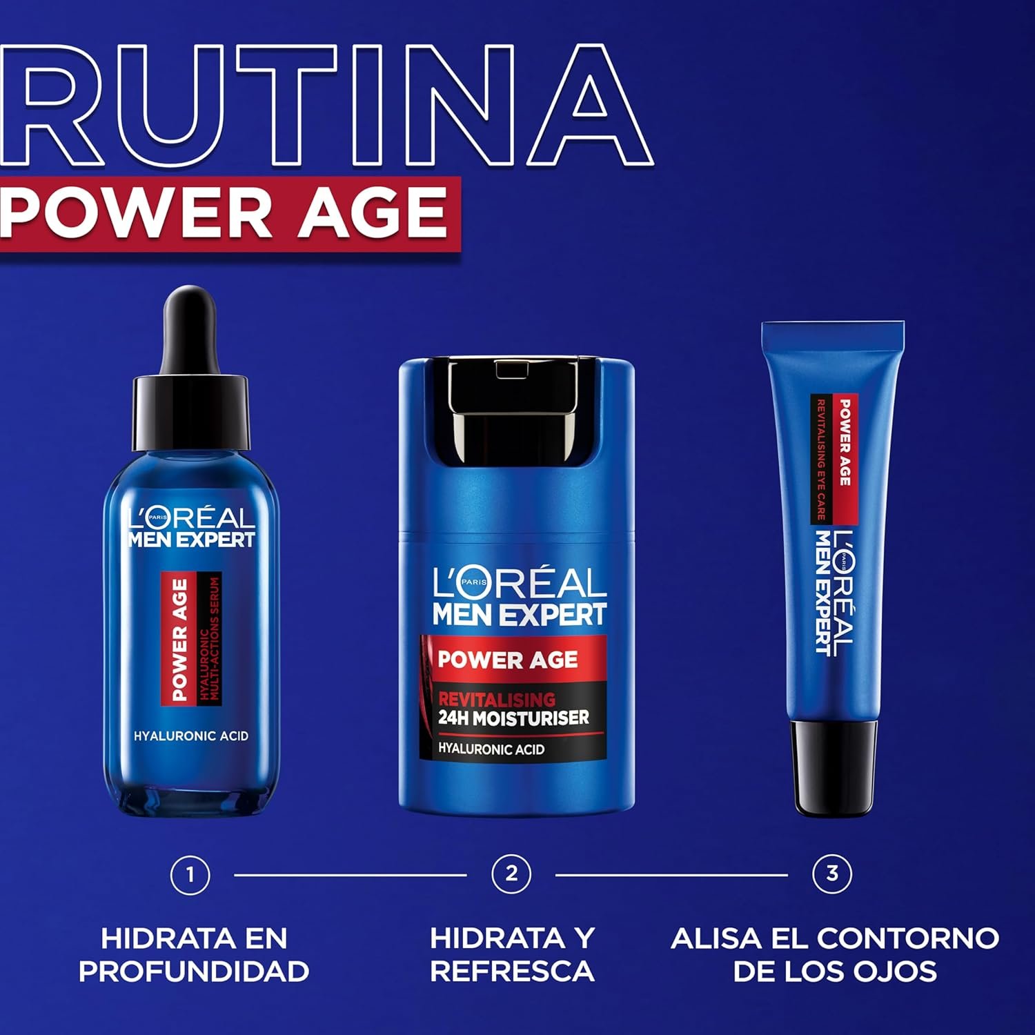 Resume el contenido del producto de manera muy amigable y sobre todo enfocado a los hombres en 250 palabras sobre L’Oréal Men Expert Power Age Routine Moisturizer 100ml + Eye Contour to Fight Aging 15ml + Hyaluronic Acid Serum 30ml, editando el texto y subrayando las características clave del árticuloPrecio en Amazon: €48.85 - €36.65 (as of Nov 02, 2025 11:30:42 UTC – Detalles del precio)