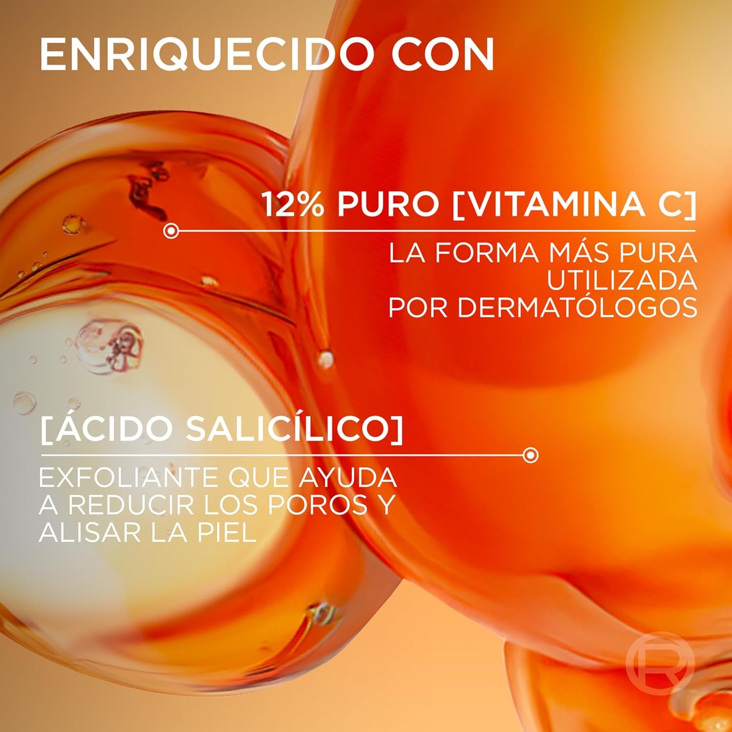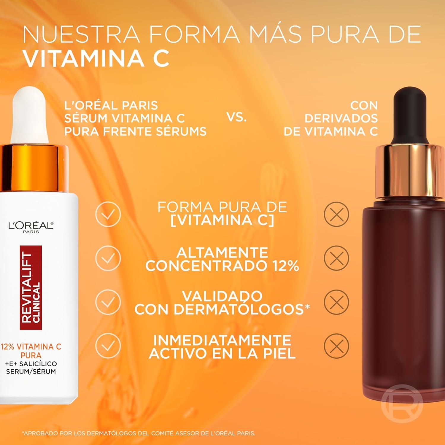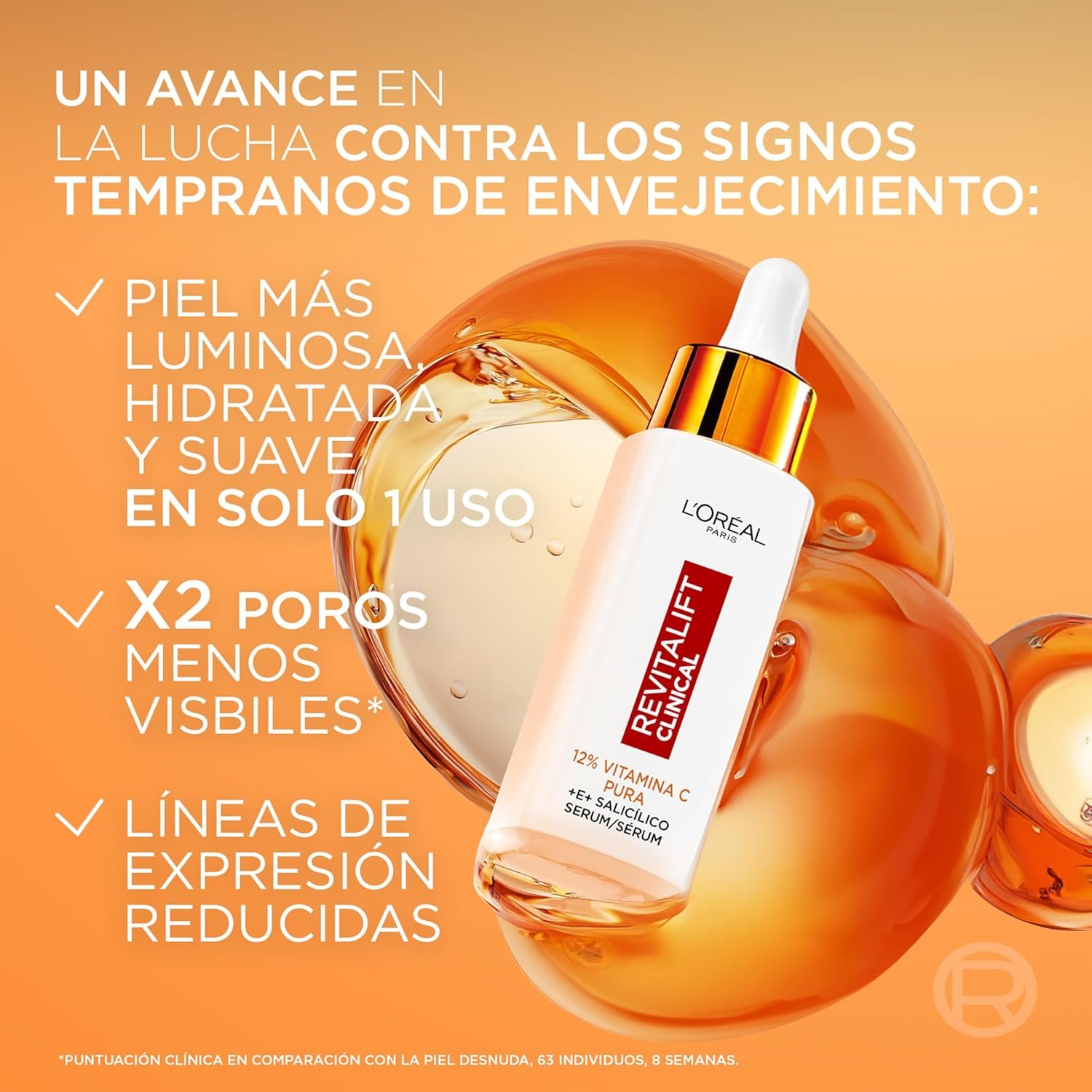 Resume el contenido de L’Oréal Paris Facial Serum 12% Pure Vitamin C, Brighter Skin and Less Visible Pores, Reduces Wrinkles, Depigmentation and Pores, Revitalift Clinical, 30 ml en español y en sólo 10 palabras