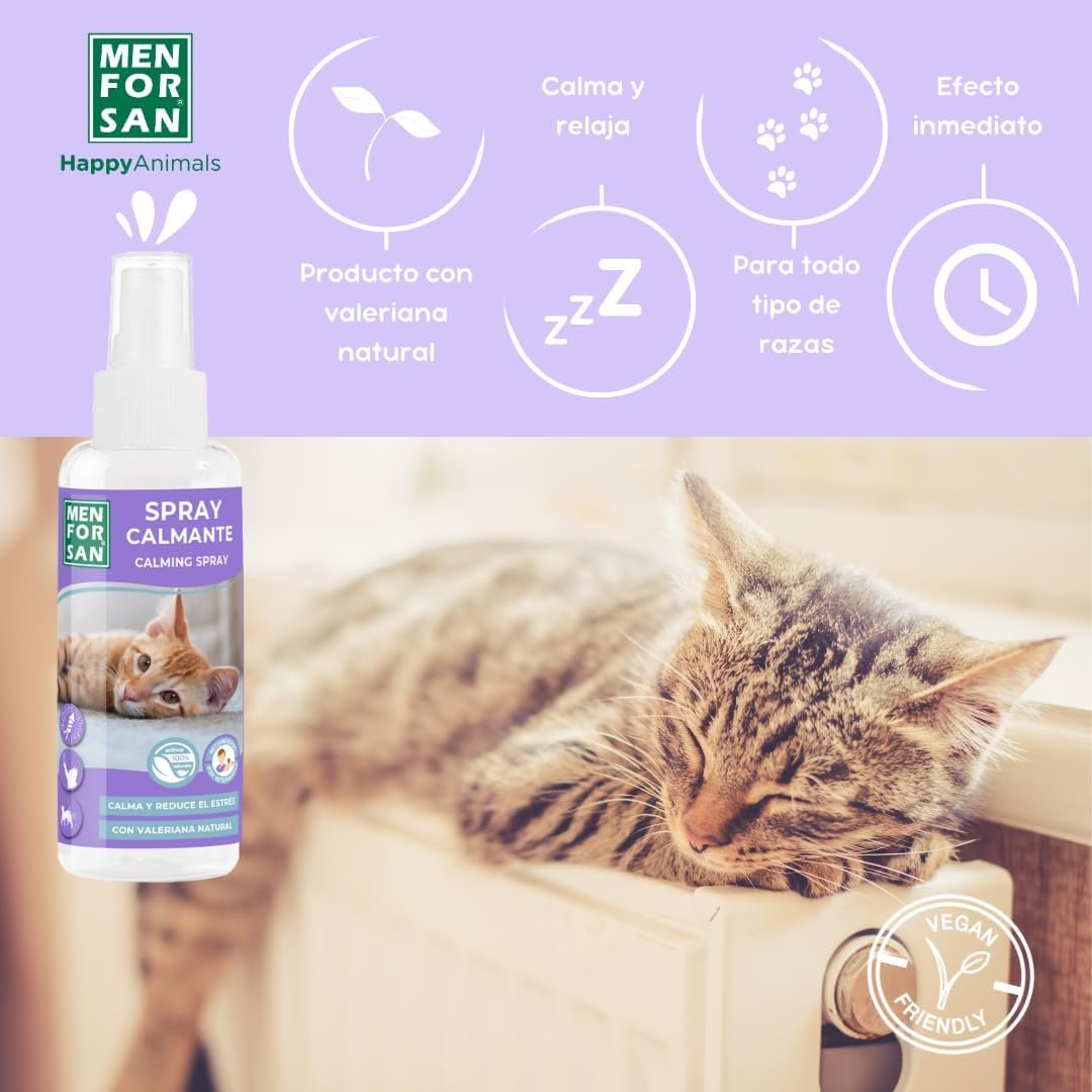 Resume el contenido del producto de manera muy amigable y sobre todo enfocado al cuidado de mascotas y la salud de ellas en 250 palabras sobre MENFORSAN Calming Spray for Cats | with Natural Valerian | Soothes and Reduces Stress | Immediate Effect | 60 ml, editando el texto y subrayando las características clave del articuloPrecio en Amazon: €12.63 (as of Apr 07, 2026 14:18:35 UTC – Detalles del precio)