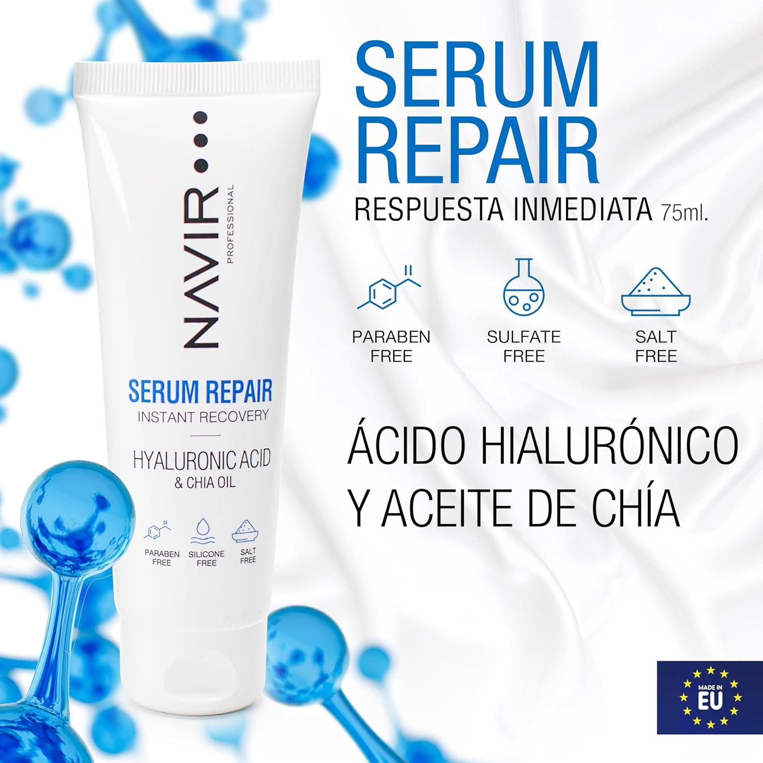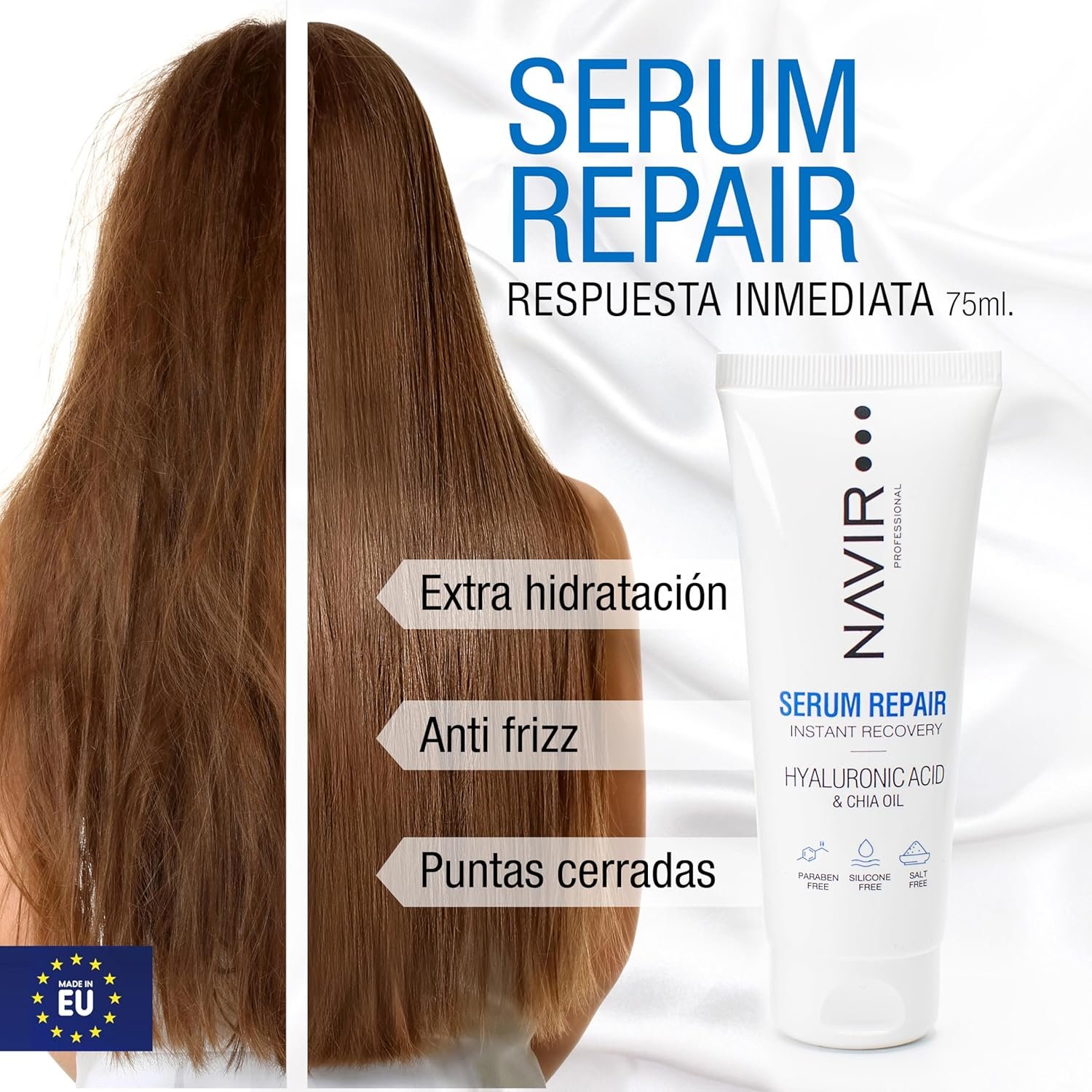 Resume el contenido del producto de manera muy amigable y sobre todo enfocado a las mujeres en 250 palabras sobre NAVIR Profesional | Dry and Damaged Hair Serum with Hyaluronic Acid, Keratin and Chia Oil – Anti Frizz and Deep Hydration – Hydrating Hair Treatment – Sulfate and Paraben Free – 75 ml, editando el texto y subrayando las características clave del árticuloPrecio en Amazon: €9.99