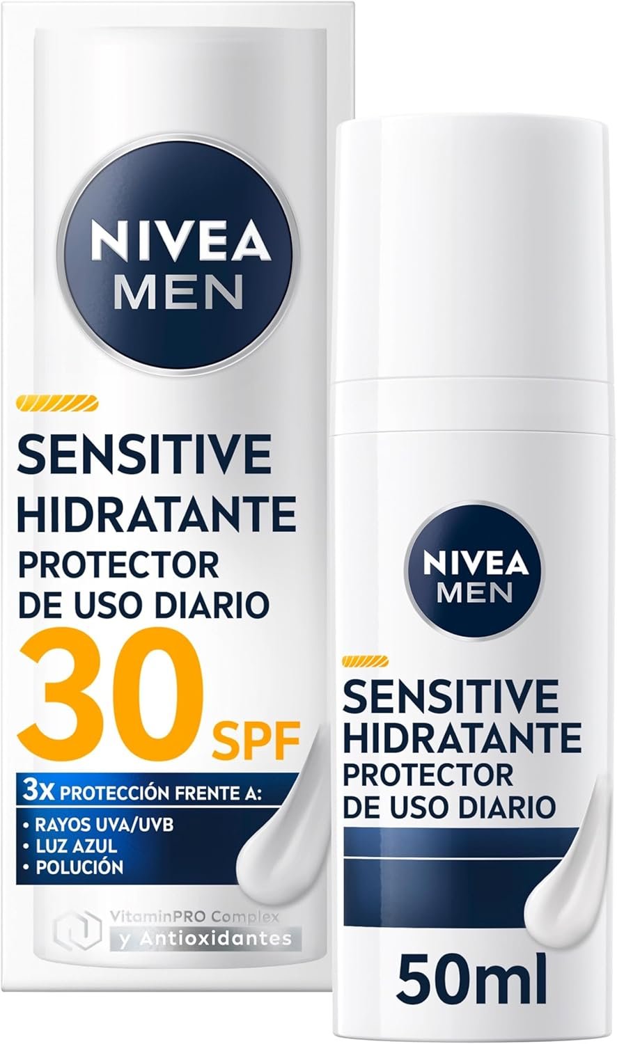 Resume el contenido de NIVEA MEN Sensitive FP30 Daily Protective Moisturizer (50ml), Men’s Moisturizing Face Cream, Sunscreen for Sensitive Skin with Chamomile, Provitamin B5, Vitamin E and Licoccal A en español y en sólo 10 palabras