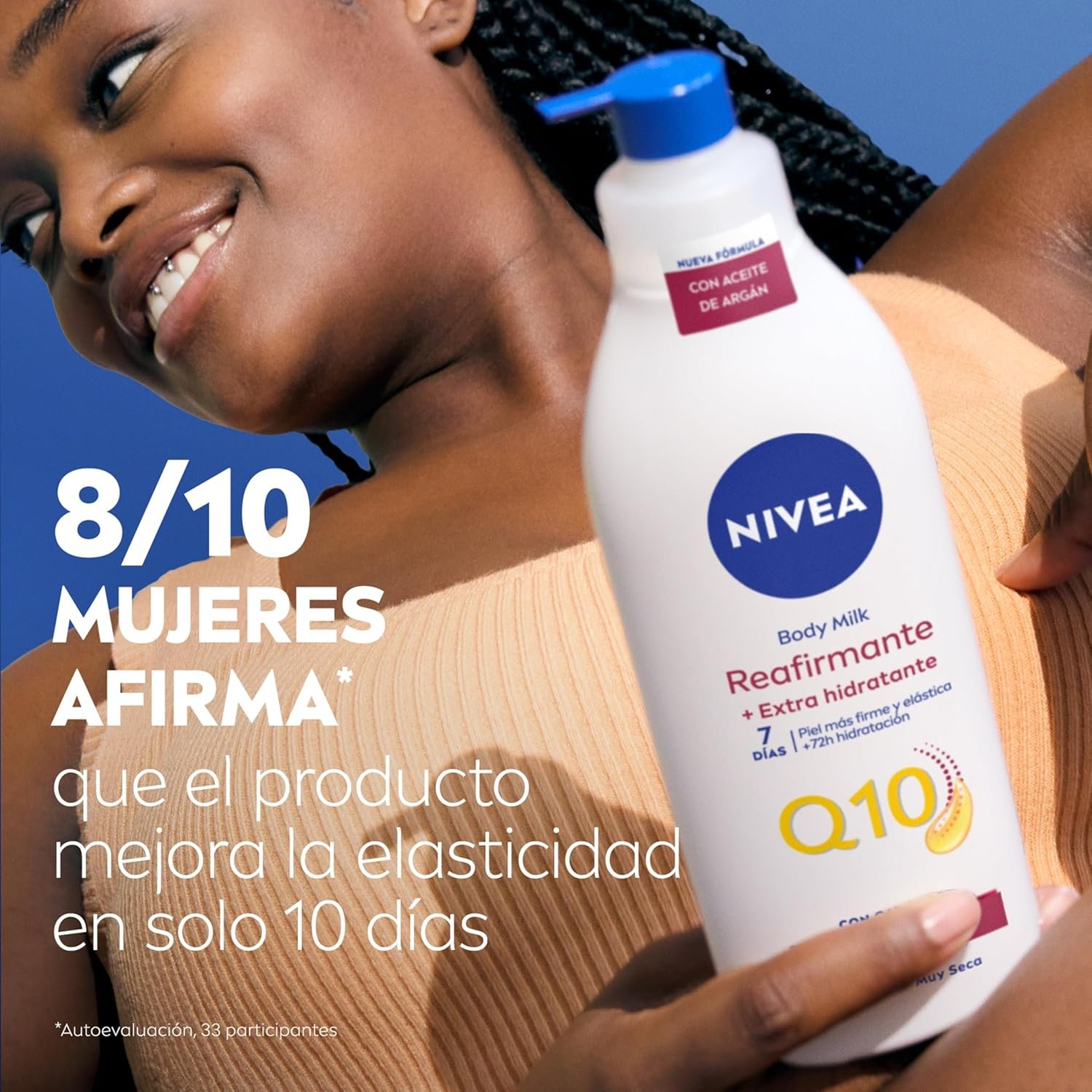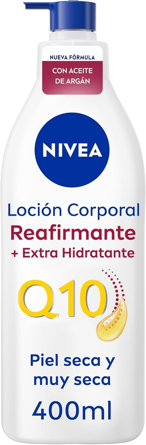 Resume el contenido del producto de manera muy amigable y sobre todo enfocado a las mujeres en 250 palabras sobre NIVEA Q10 Argan Oil Body Milk Firming + Extra Moisturizing (400ml), Firming Body Lotion for Dry Skin, Nourishing Body Moisturizer, editando el texto y subrayando las características clave del árticuloPrecio en Amazon: €6.75 - €5.94