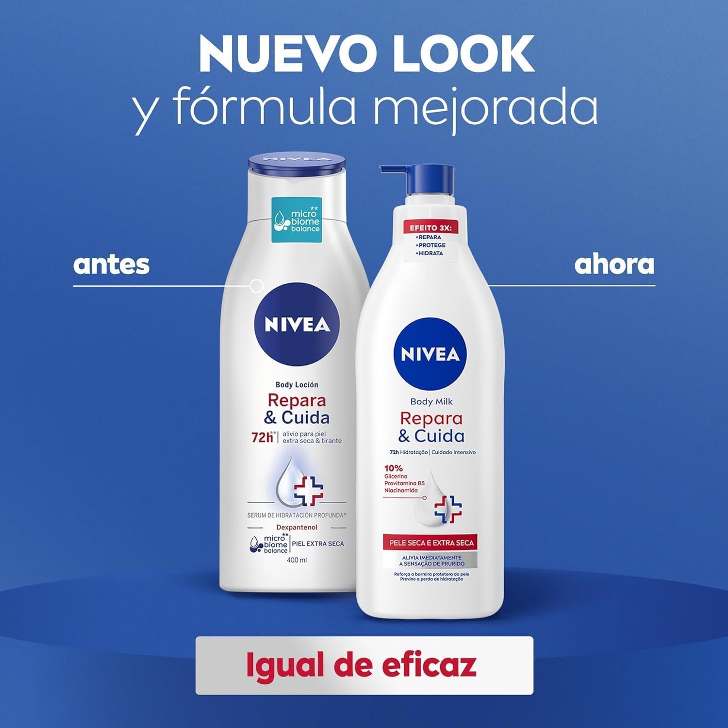 Resume el contenido de NIVEA Repair & Care Body Milk, Body Moisturizer for Dry & Extra Dry Skin, Moisturizer with 72h Hydration and Intensive Care, 1 x 400ml en español y en sólo 10 palabras