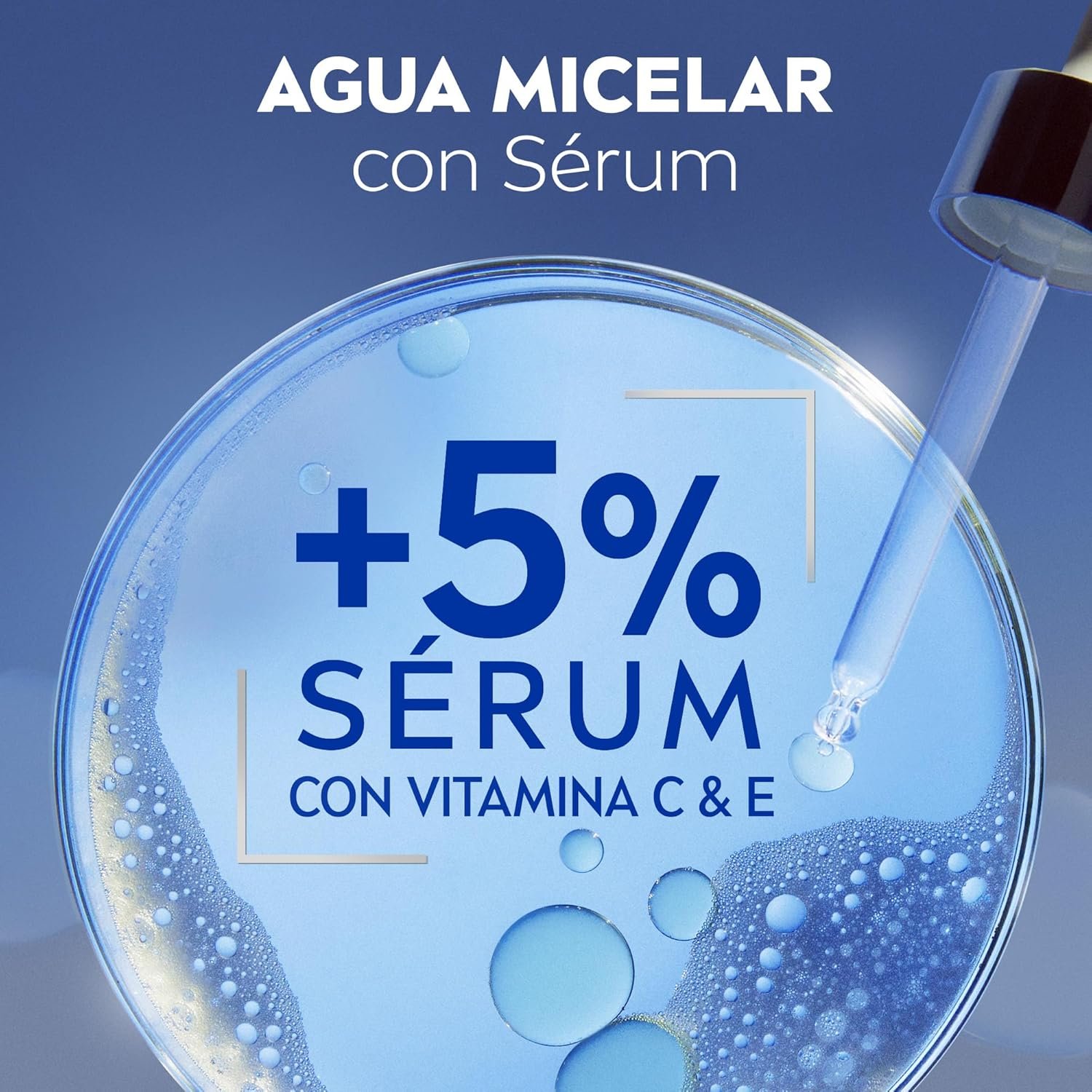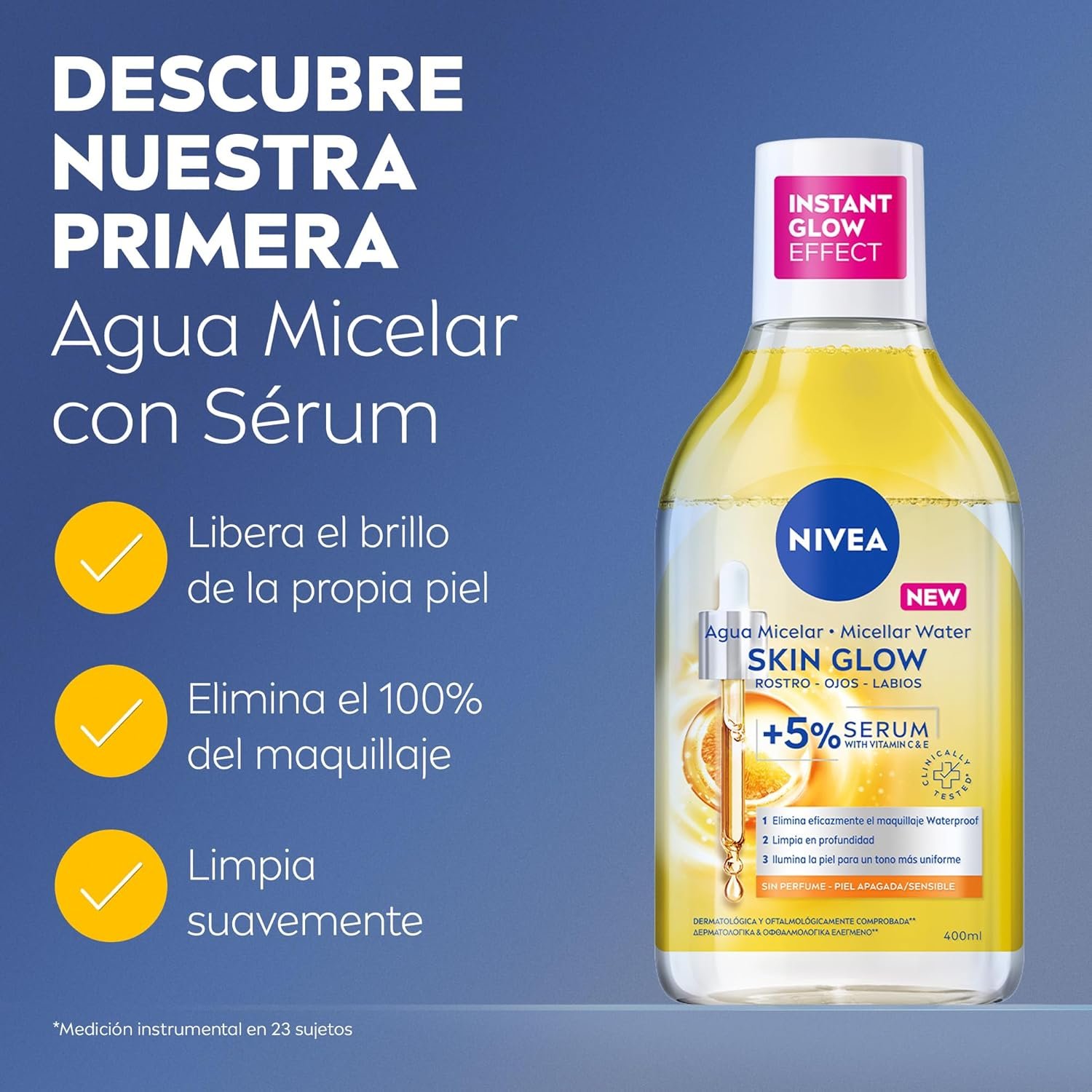 Resume el contenido de NIVEA Skin Glow Bi-Phase Micellar Water – Facial Cleanser – With 5% Vitamin C and E Serum – Face and Lip Makeup Remover – Energizing – Brightens – Moisturizing – Off and Sensitive Skin – 400 ml en español y en sólo 10 palabras