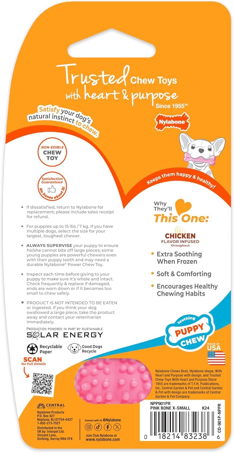 Resume el contenido del producto de manera muy amigable y sobre todo enfocado al cuidado de mascotas y la salud de ellas en 250 palabras sobre Nylabone | Puppy Teething Chews | Textured Bone Shape | Pink | Chicken Flavor | For Very Small Dogs or Puppies (up to 7kg) | Moderate Bites or First Teeth, editando el texto y subrayando las características clave del articuloPrecio en Amazon: €5.49 (as of Feb 28, 2026 15:58:14 UTC – Detalles del precio)