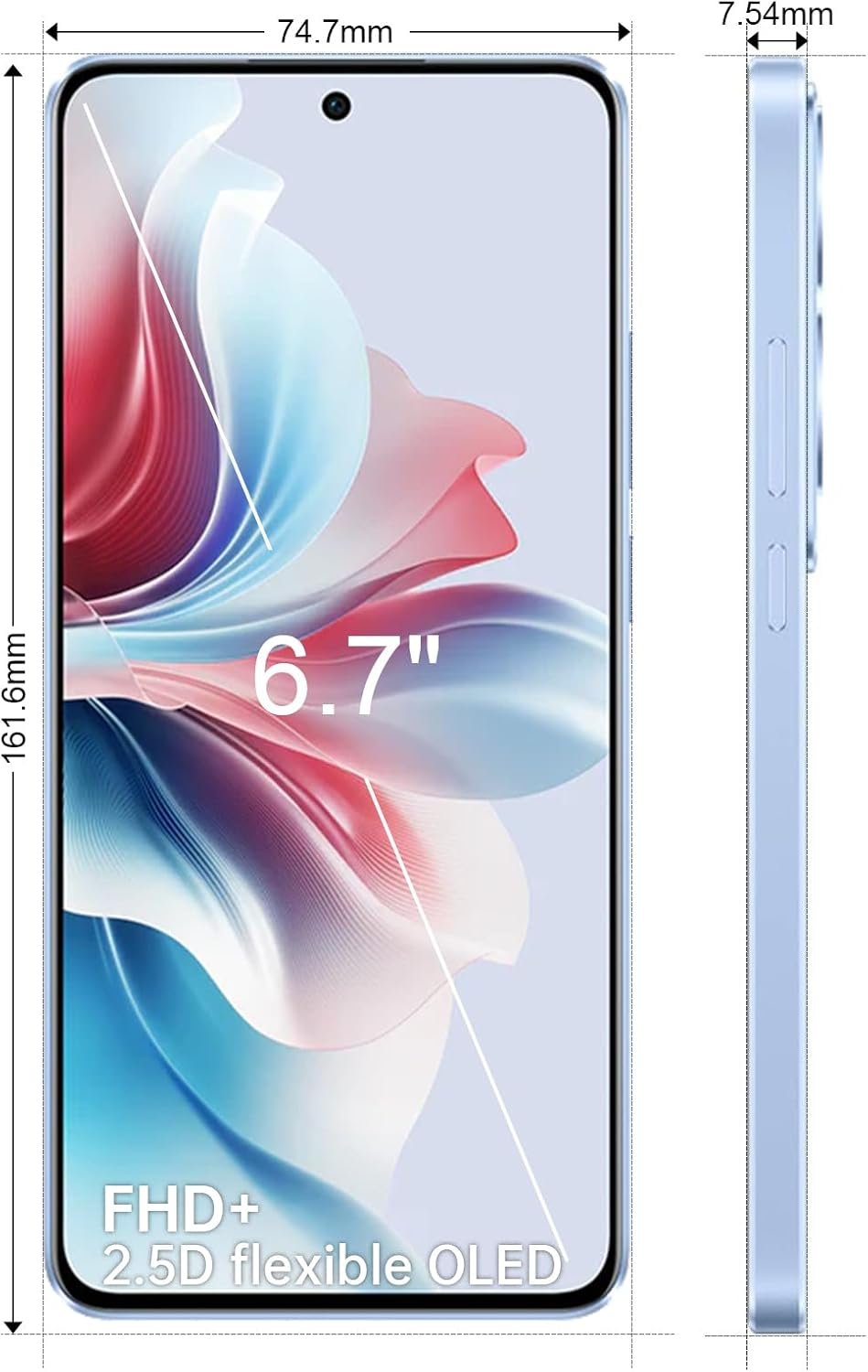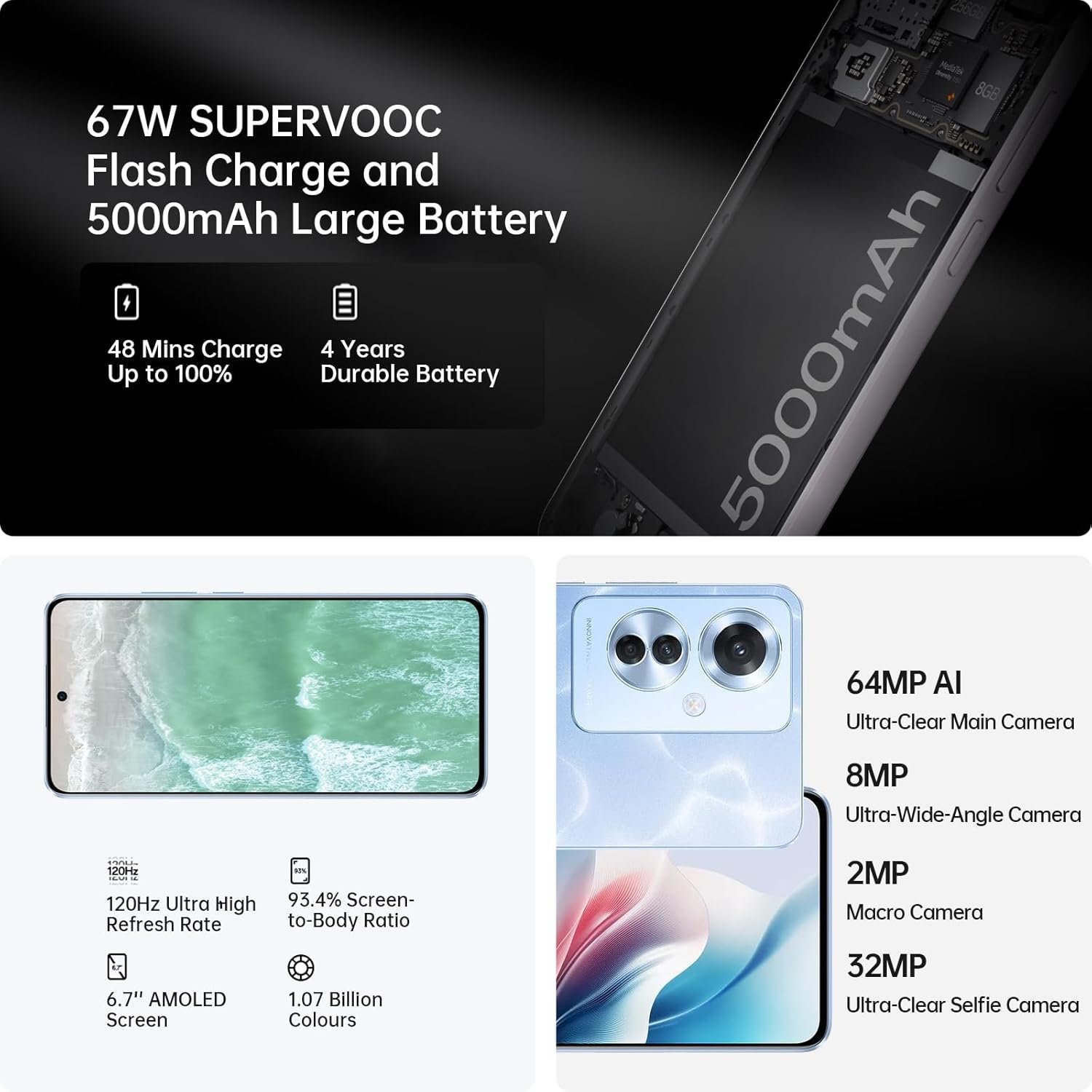 Resume el contenido del producto de manera muy técnica en 250 palabras sobre OPPO Reno11 F 8+256GB Unlocked Smartphone, Mobile Phone, Screen 6.7″ OLED 120Hz, Dimensity 7050 5G, IA Triple Camera 64MP, SUPERVOOC 67W, Large Battery 5000mAh, 4K Video, NFC, Dual SIM, Blue, editando el texto y subrayando las características clave del teléfonoPrecio en Amazon: €199.00 (as of Feb 16, 2026 09:45:15 UTC – Detalles del precio)