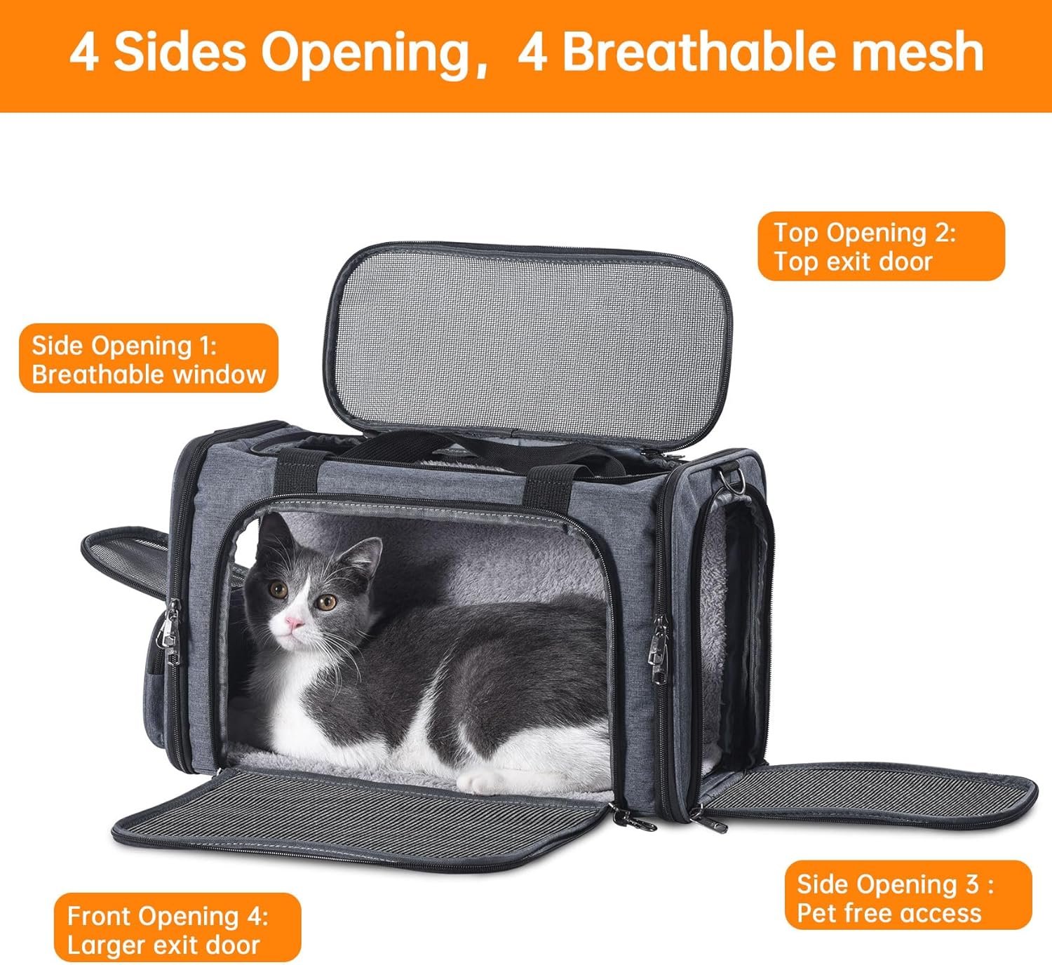 Resume el contenido de Pet Travel Carrier Airplane Approved Under Seat, TSA Airline Approved, Soft-Sided Carrier Bag for Cats, Dogs, 17.5 x 8.5 x 11 Inches, Grey en español y en sólo 10 palabras
