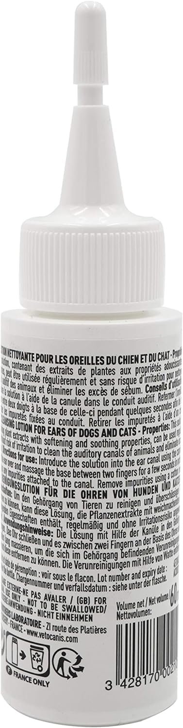 Resume el contenido del producto de manera muy amigable y sobre todo enfocado al cuidado de mascotas y la salud de ellas en 250 palabras sobre Vetocanis – Ear Cleaner for Dogs and Cats of All Ages and Sizes – Hygiene for Ears – All Breeds and Ages – Plant Extract Based Formula – Cat Ear Cleaner 60ml, editando el texto y subrayando las características clave del articuloPrecio en Amazon: €6.59