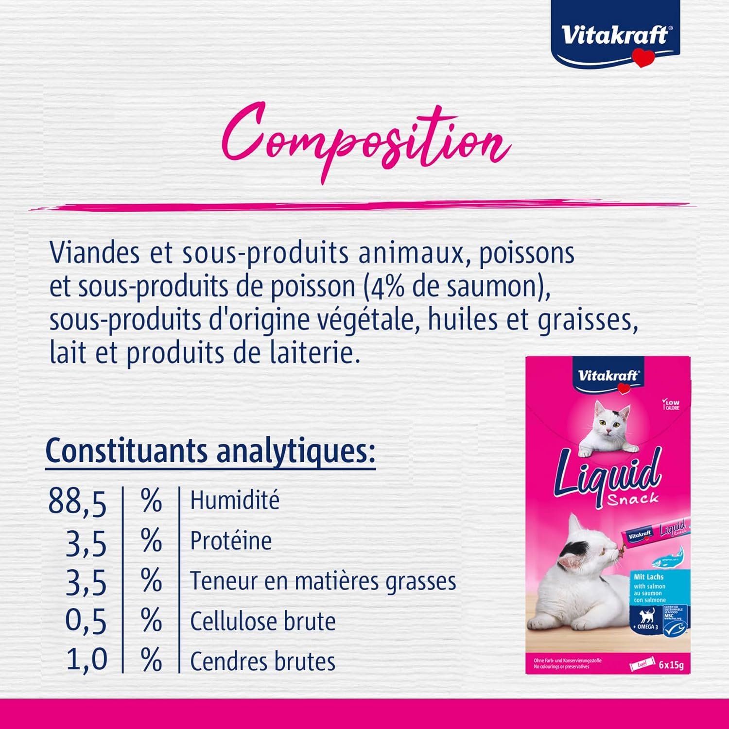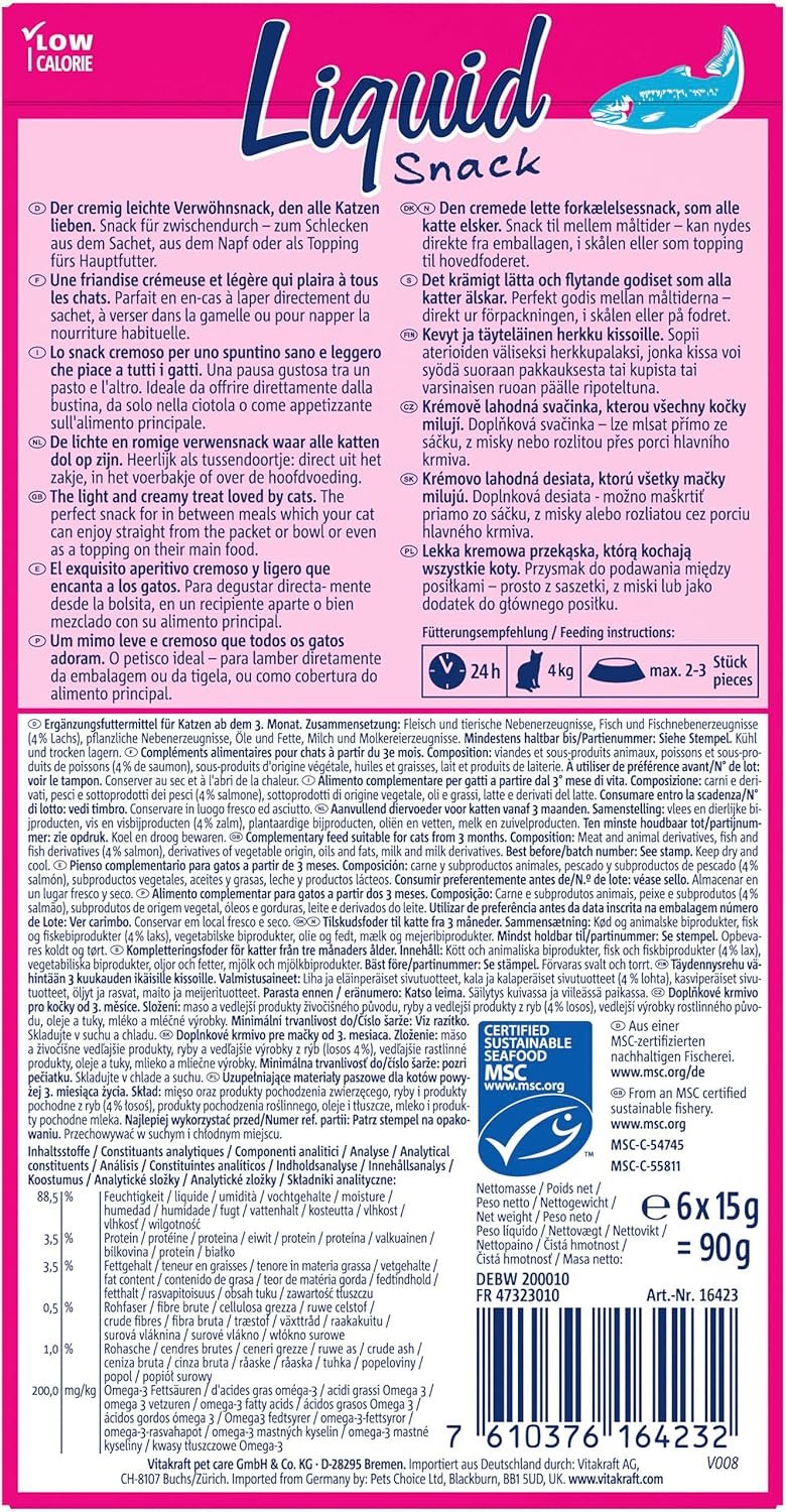 Resume el contenido del producto de manera muy amigable y sobre todo enfocado al cuidado de mascotas y la salud de ellas en 250 palabras sobre Vitakraft Liquid Snack, Creamy Cat Snack with Salmon and Omega 3 Fatty Acids, Individual Sachets, for Healthy Skin (1 Pack of 6 x 15g), editando el texto y subrayando las características clave del articuloPrecio en Amazon: €2.67 - €1.69 (as of Dec 17, 2025 15:43:36 UTC – Detalles del precio)