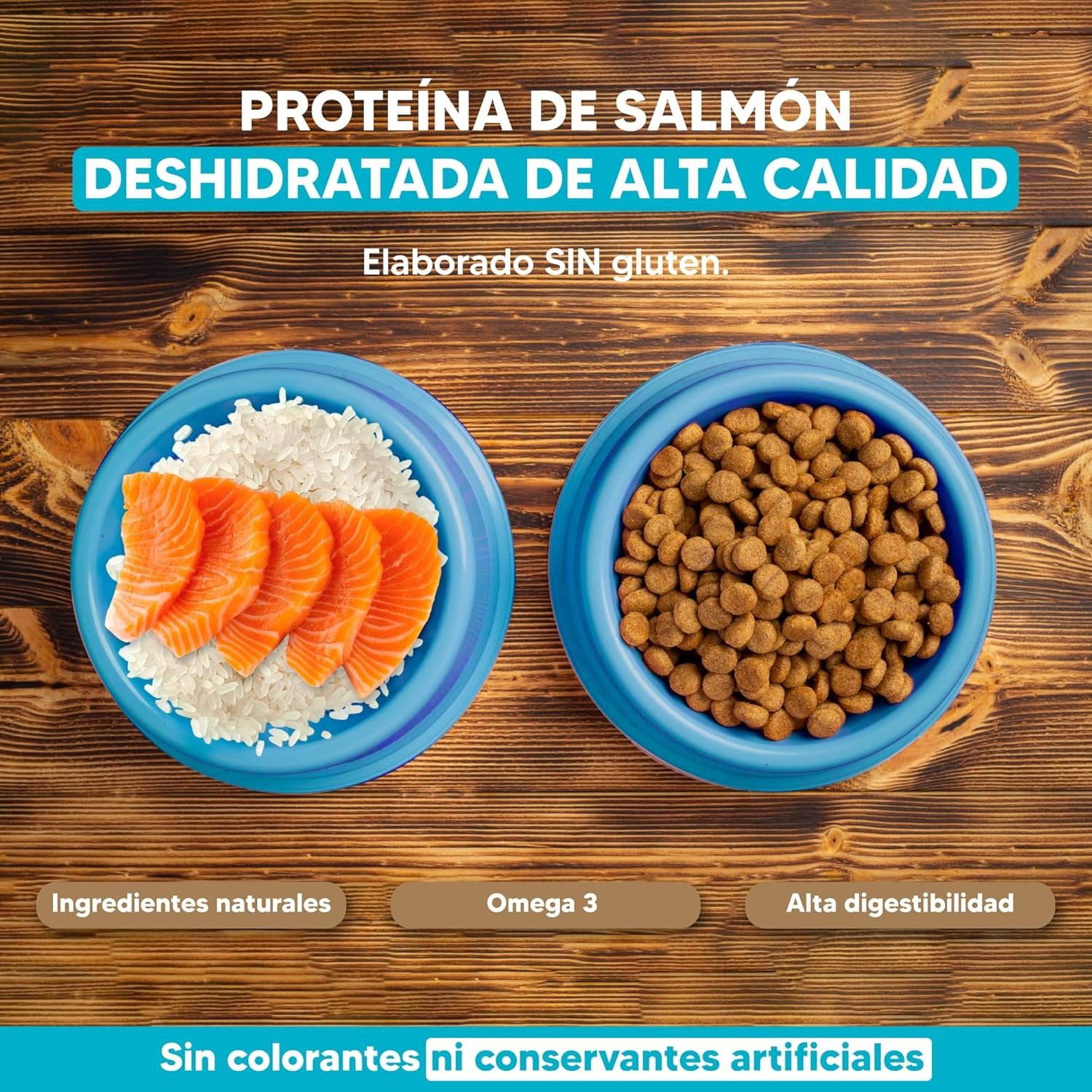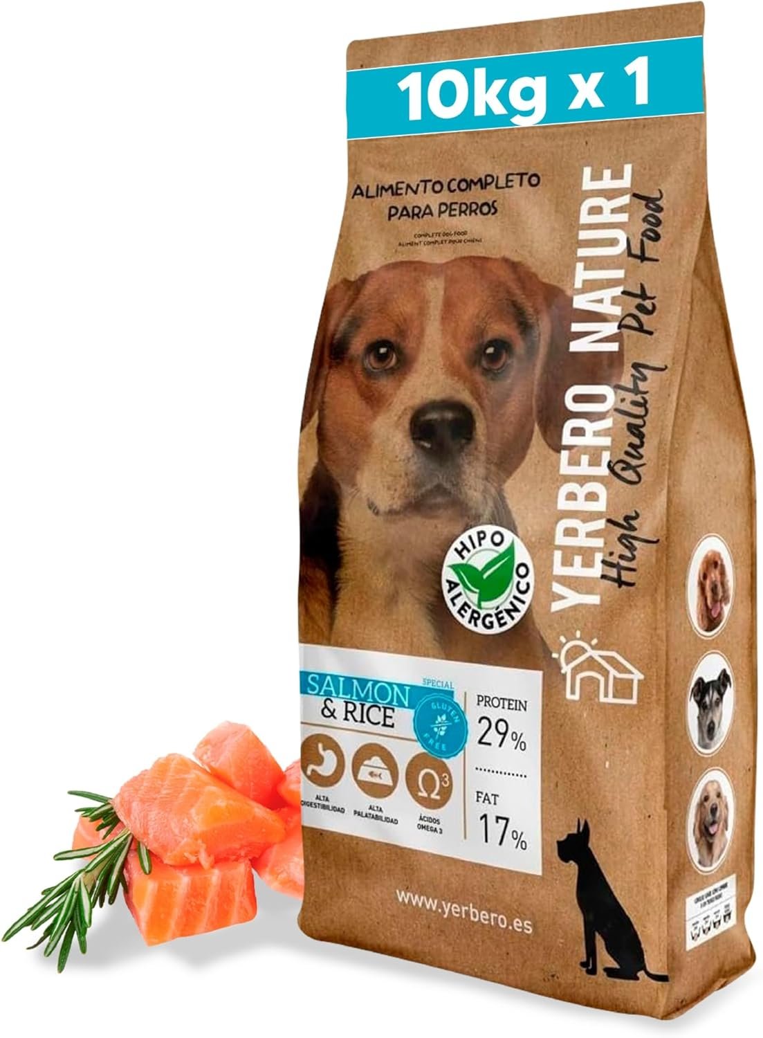 Resume el contenido de YERBERO Nature Salmon & Rice 10 kg Gluten Free Dog Food with Lamb – Hypoallergenic Food for Dogs with High Digestibility – with Omega 3 for Shiny Hair en español y en sólo 10 palabras